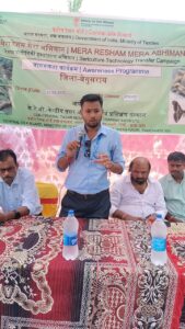 बेगूसराय ब्यूरो। एरी रेशम कीट पालन तकनीक से अवगत हुए किसान केंद्रीय रेशम बोर्ड वस्त्र मंत्रालय भारत सरकार की तत्वावधान में मेरा रेशम मेरा अभिमान राष्ट्रीय अभियान के तहत किसान जागरूकता कार्यक्रम का आयोजन किया गया। गोपालपुर बेगूसराय में आयोजित कार्यक्रम में केंद्रीय रेशम बोर्ड केंद्रीय अनुसंधान एवं प्रशिक्षण संस्थान रांची से पधारे वैज्ञानिक आशू कुमार ने किसानों को एरी रेशम होस्ट प्लांट अरंडी की खेती एवं प्रबंधन के साथ ही एरी रेशम कीट पालम की नई तकनीक की जानकारी दी। उन्होंने किसानों को सिल्क समग्र दो योजना के अंतर्गत मिलने वाले लाभ एवं प्रावधानों की भी जानकारी दी। मौके पर राज्य रेशम निदेशालय मुजफ्फरपुर के महेश प्रसाद, राजेश कुमार के साथ ही बड़ी संख्या किसान उपस्थित थे।