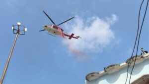 लोधेश्वर धाम महादेवा में कांवड़ियों पर हेलीकॉप्टर से की गई पुष्प वर्षा