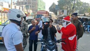 सिलीगुड़ी ट्रेफिक पुलिस की हेलमेट अवेयरनेस में नई पहल, फाइन की जगह सांता द्वारा केक दिए जा रहे हैं