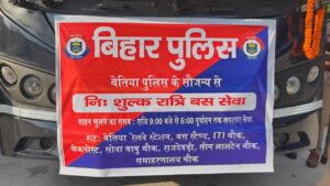 _रामनगर-नरकटियागंज_ _प०चम्पारण (बिहार)_ बेतिया। दुर्गा पूजा, दीपावली और छठ महापर्व को लेकर बेतिया पुलिस ने जिलेवासियों को एक अनूठा तोहफ़ा दिया है। पुलिस अधीक्षक शौर्य सुमन के निर्देशन में “सुरक्षित सफर सुविधा” के तहत निःशुल्क बस सेवा शुरू की गई है, जिससे देर रात यात्रा करने वाले लोगों को अब असुविधा और असुरक्षा का सामना नहीं करना पड़ेगा।