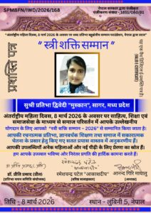 लुंबिनी,  ! एक बार फिर प्रतिभा द्विवेदी “मुस्कान” ने सागर मध्यप्रदेश का नाम काव्य लेखन में विश्व स्तर पर रोशन किया है। सागर की उभरती कवयित्री तथा सहायक बी.एड प्राध्यापिका रहीं सुश्री प्रतिभा द्विवेदी “मुस्कान” को नेपाल में सम्मानित किया गया है। इसके पहले भी विभिन्न आभासी प्रतियोगिताओं में लगातार पाँच बार सम्मानित किया जा चुका है यह छठा अवसर है। प्रतिभा द्विवेदी “मुस्कान” पंडित श्री हरिराम द्विवेदी शास्त्रि जनता बॉय स्कूल के रिटायर्ड शिक्षक की सुपुत्री हैं।अंतर्राष्ट्रीय महिला दिवस 8 मार्च के अवसर पर सागर जिले की कवयित्री तथा सहायक बी एड प्राध्यापिका रहीं प्रतिभा द्विवेदी “मुस्कान” को “स्त्री शक्ति सम्मान” से सम्मानित किया गया है।
